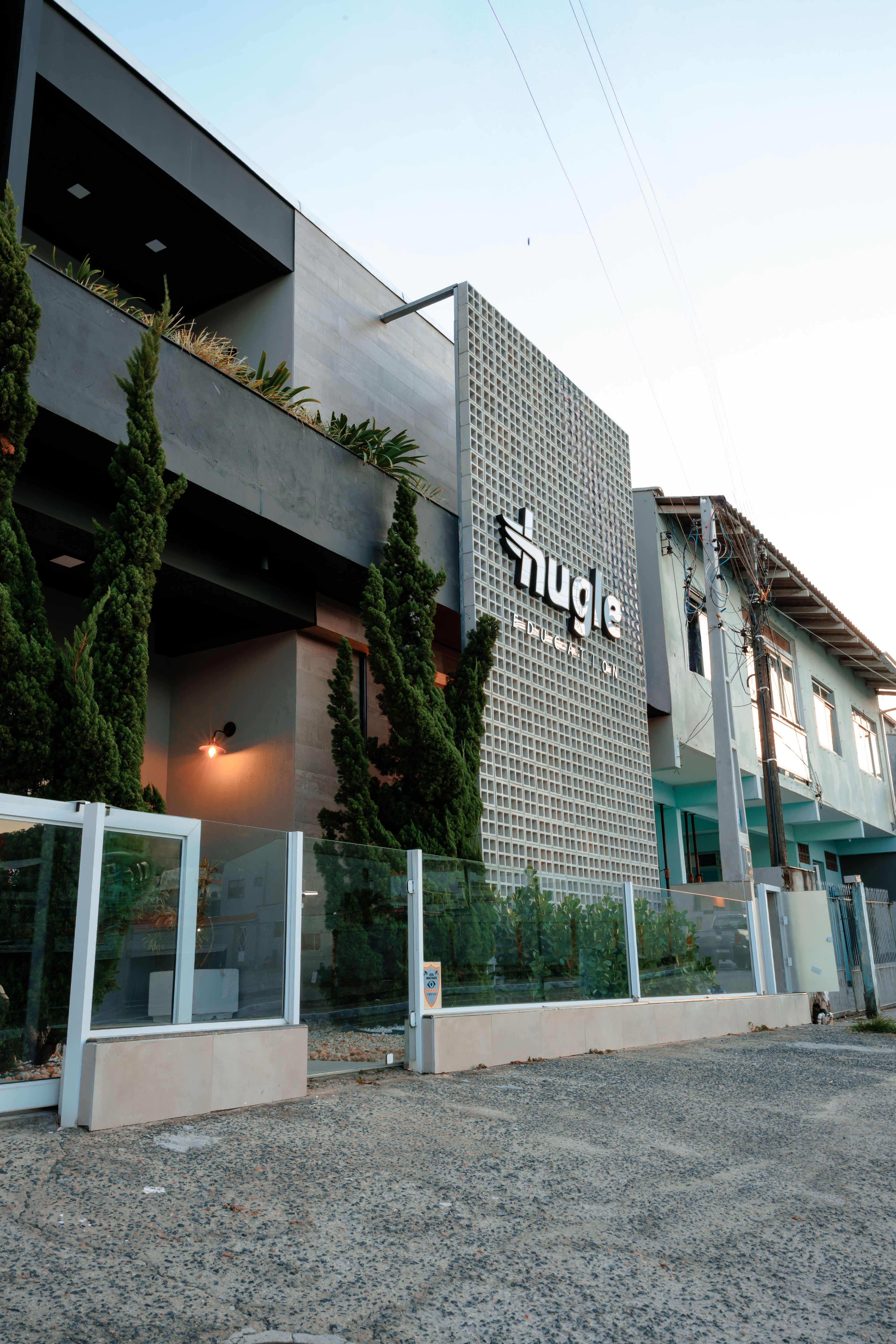 Com a mudança, reformamos integralmente o térreo para receber a segunda unidade de uma escola de inglês, seguindo o novo padrão criado no projeto, que servirá como inspiração para a futura reforma da matriz em Camboriú. O projeto do térreo segue a linguagem industrial, incorporando infraestruturas aparentes, tijolinho e cimento queimado, e acrescenta uma temática americana nas salas de aula, inspiradas em cidades icônicas dos Estados Unidos. Cada ambiente traz elementos característicos da região: crânio de long horn na sala do Texas, claquetes e adereços de Hollywood, entre outros detalhes que reforçam a experiência cultural e imersiva para os alunos.